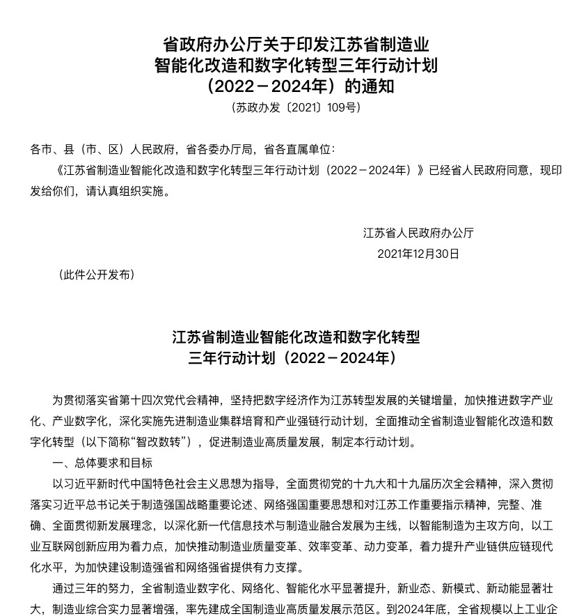 省政府办公厅关于印发江苏省制造业智能化改造和数字化转型三年行动计划(2022-2024年)的通知