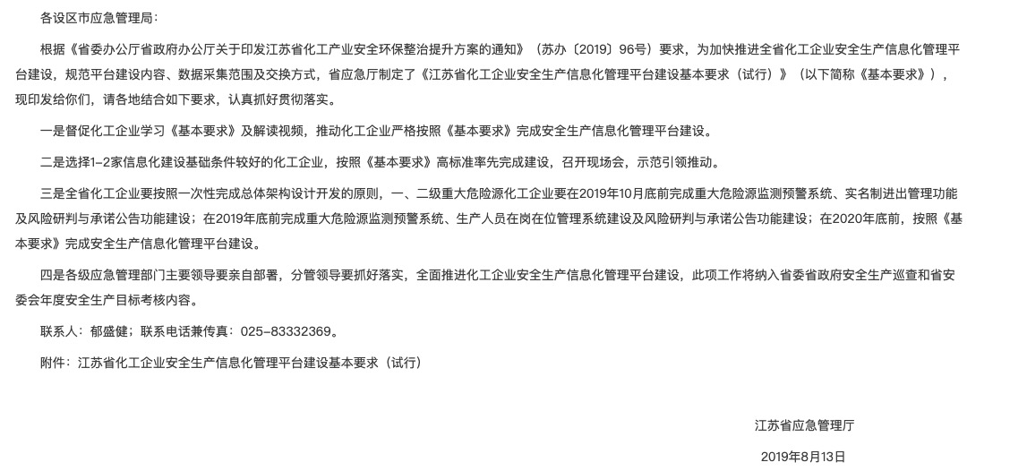 省应急厅关于印发江苏省化工企业安全生产信息化管理平台建设基本要求(试行)的通知
